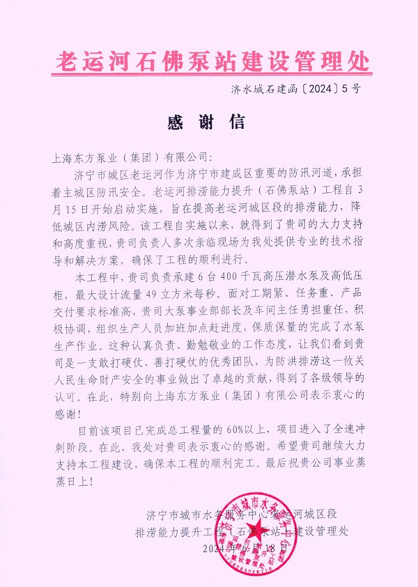 濟寧市城區老運河作為濟寧市建成區重要的防汛河道,承接著小府河、小洸河、越河和任城河的河水合流下泄功能。由于老運河城區段缺乏強排設施,水位調控能力較弱,若發生洪水,易導致城區內澇。為提高老運河城區段的排澇能力,濟寧市自3月開始啟動實施石佛泵站建設工程。東方泵業積極參與其中,為石佛泵站提供了高效軸流泵及先進電氣設備,為城區防洪排澇保駕護航。