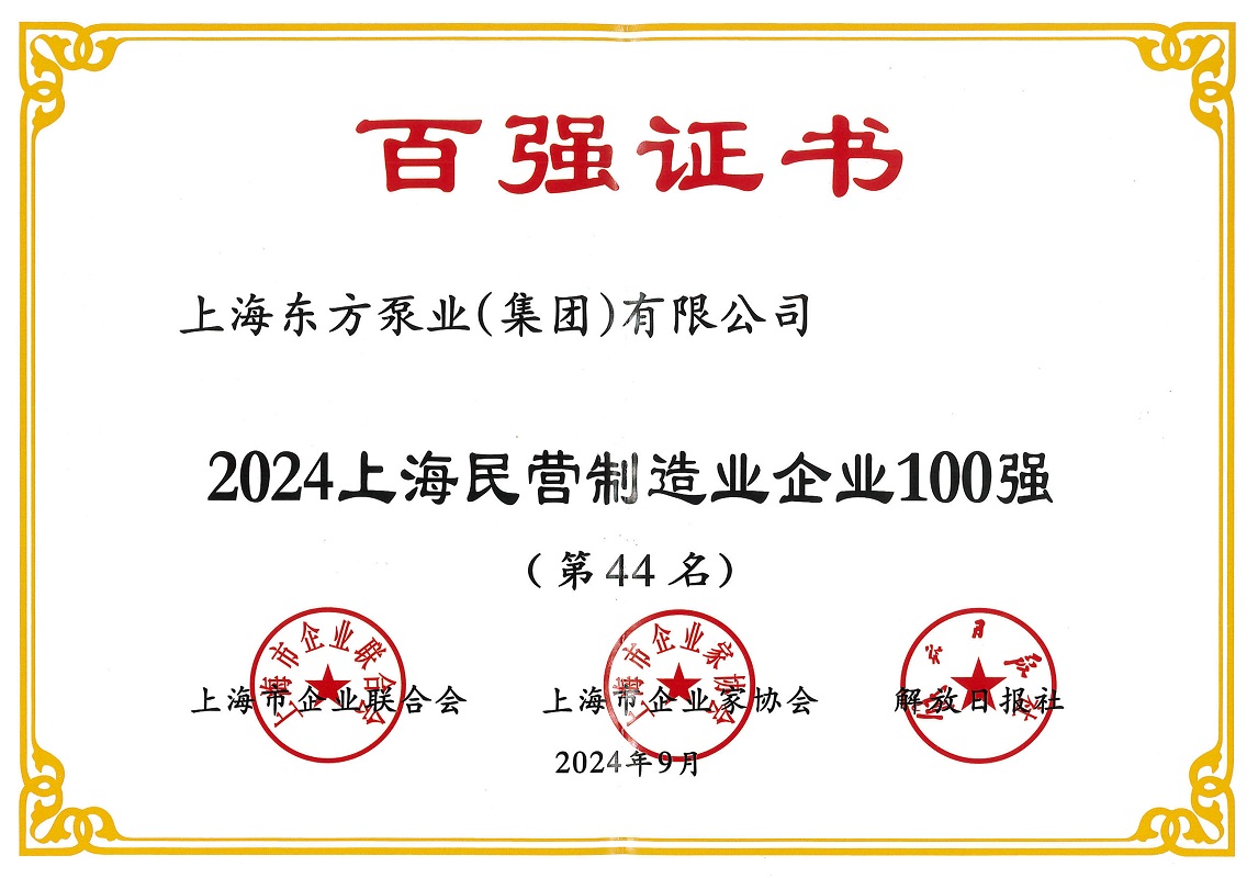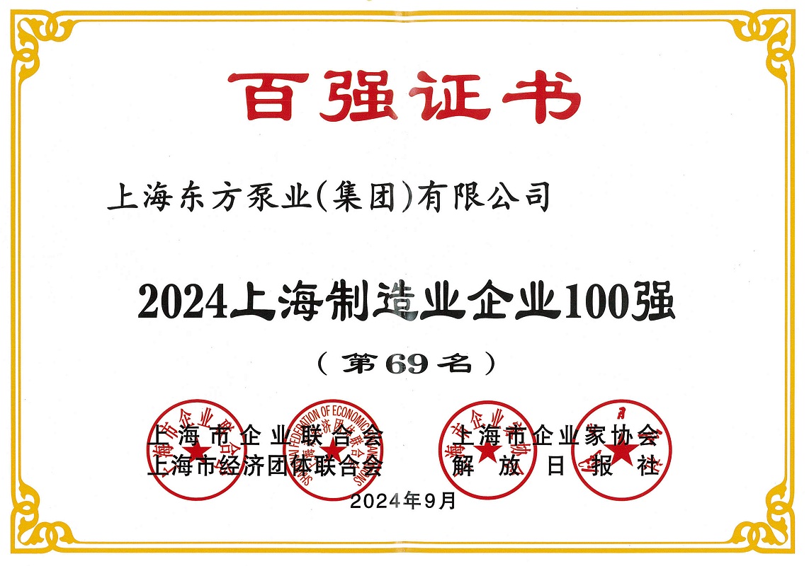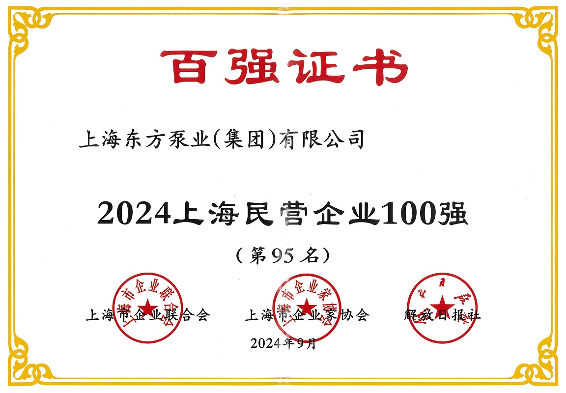 近日,2024上海百強企業發布會順利召開并發布了多項百強企業榜單。上海東方泵業(集團)有限公司在此次評選中榮獲2024上海民營企業100強(第95名)、2024上海民營制造業企業100強(第44名)、2024上海制造業企業100強(第69名)。